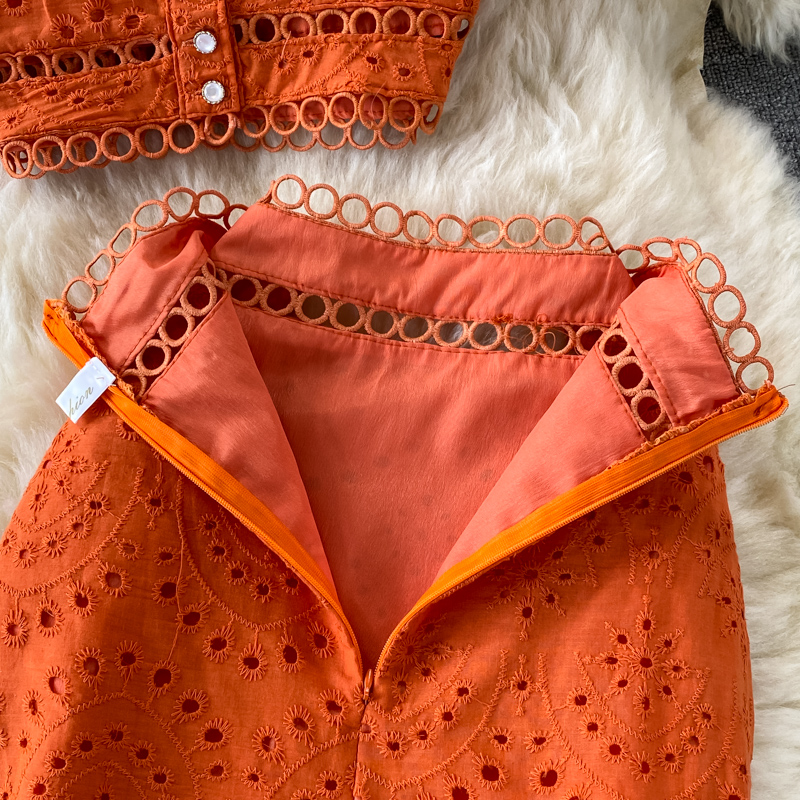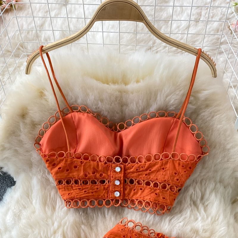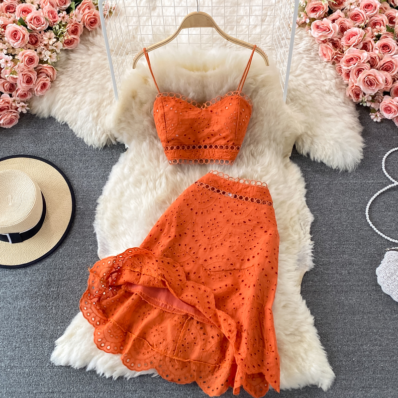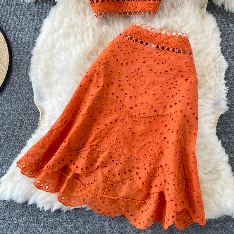 Summer Casual Beach Skirts 2 Pieces Set Women Elegant Hallow Out Sleeveless Tanks Tops A-Line Skirts Suit Female Holiday Outfits